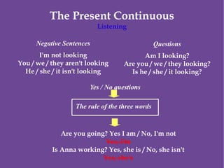 The document provides information about forming and using the present continuous tense in English. It discusses how to add "-ing" to base verbs, exceptions to this rule, questions and negatives in the present continuous, and reasons for using the tense including ongoing activities, temporary situations, describing change over time, and planned future actions. Time expressions that can be used with the present continuous are also listed.