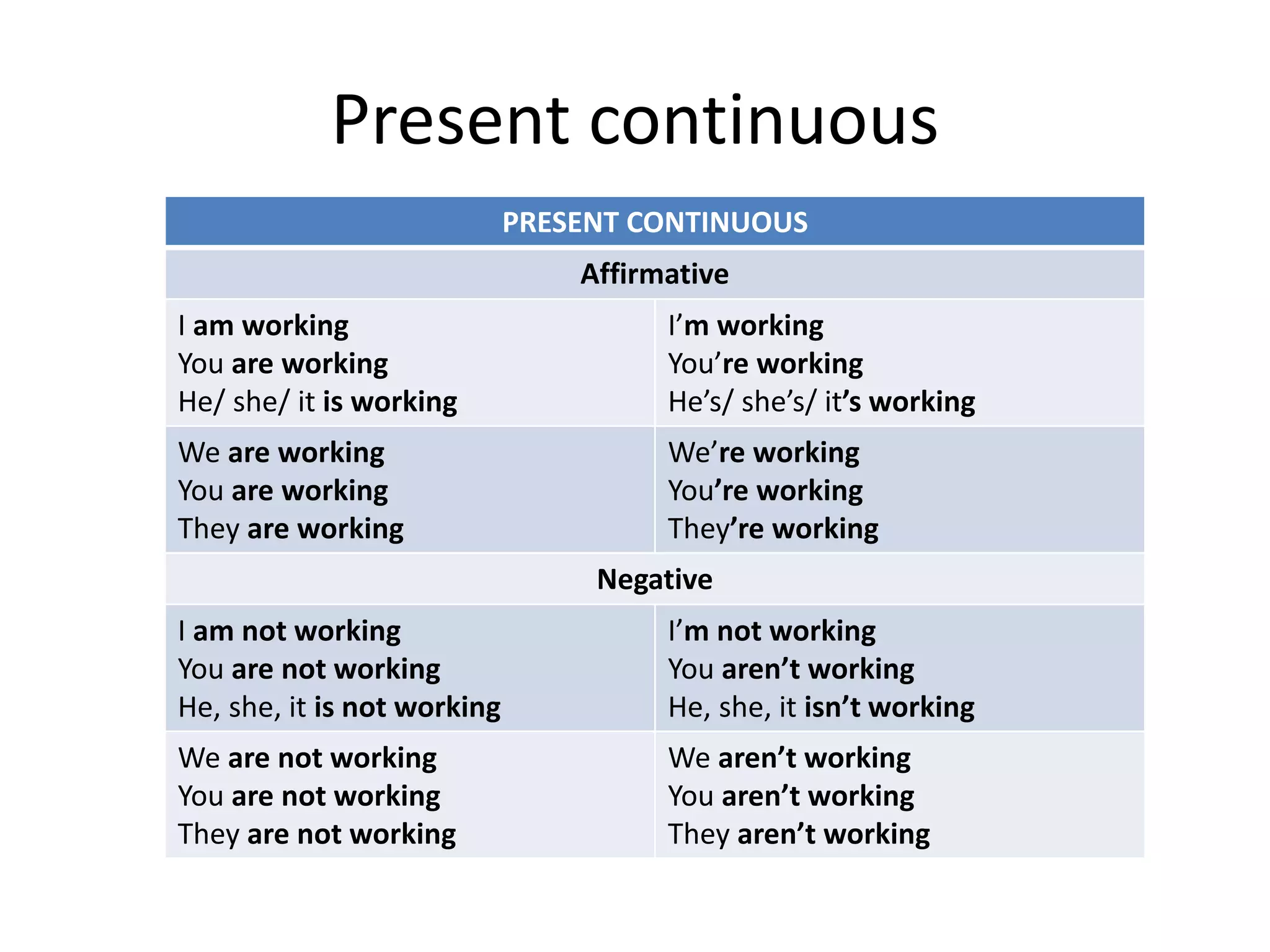 The document describes the present continuous tense in English, including its affirmative, negative, and interrogative forms for the first, second, and third person singular and plural. It provides examples for each form using common verbs like "work", "play", and "travel". It also outlines some common uses of the present continuous tense, such as describing actions in progress, asking about someone's current state or activities, and expressing future plans or arrangements that have already been made.