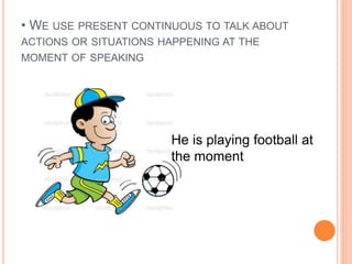 The document discusses the present continuous tense in English. It notes that the present continuous is used to talk about actions or situations happening at the moment. It provides the sentence structure and examples of the affirmative, negative, and question forms in the present continuous. It also lists time expressions commonly used with the present continuous and provides spelling rules and practice exercises related to forming the present continuous tense.