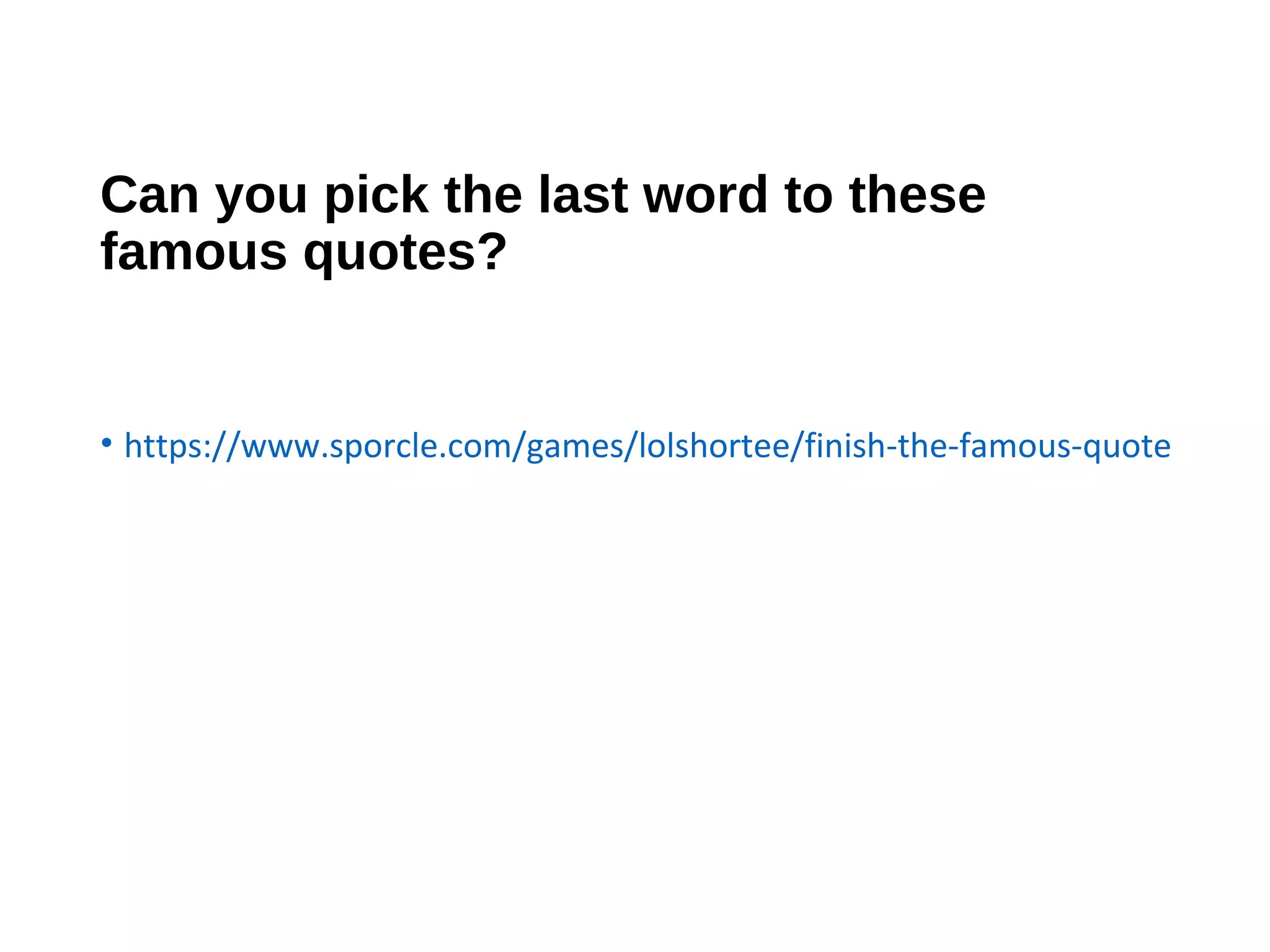 This document provides instructions for completing an activity that involves finishing famous quotes by selecting the last word. It directs the user to a website where this game can be played and tested knowledge of completing well-known sayings and phrases.