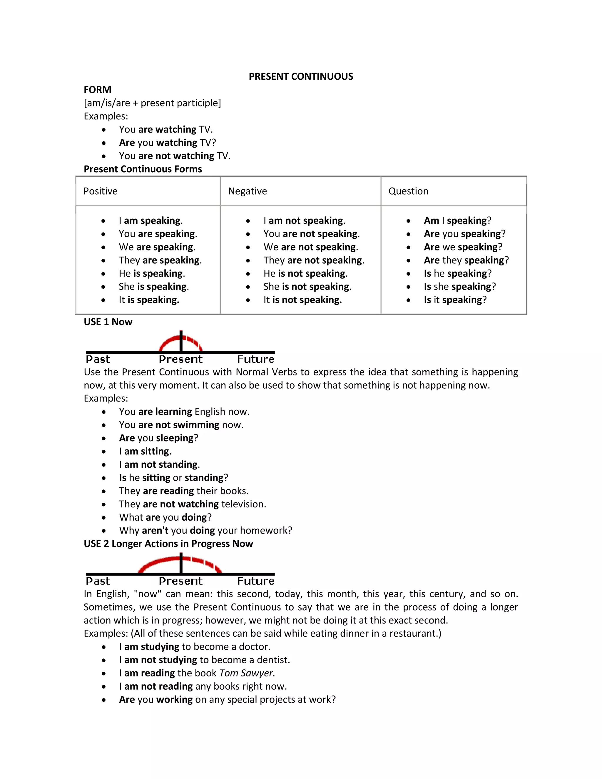 The document discusses the present continuous tense in English. It provides examples of how to form the present continuous tense using am/is/are + present participle. It also outlines four main uses of the present continuous tense: 1) to describe actions happening now, 2) longer actions in progress now, 3) near future actions, and 4) repetition and irritation with words like "always." Non-continuous verbs and mixed verbs are noted as exceptions. Adverb placement and active/passive voice are also briefly covered.