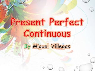 This document summarizes the use of the present continuous tense and present perfect continuous tense in English. It explains that the present continuous is used to describe actions happening now or ongoing actions. It provides examples of affirmative, negative, and interrogative sentences. It then explains that the present perfect continuous describes present situations that began in the past and continue presently, and examples of using "for" and "since" with the tense are given.