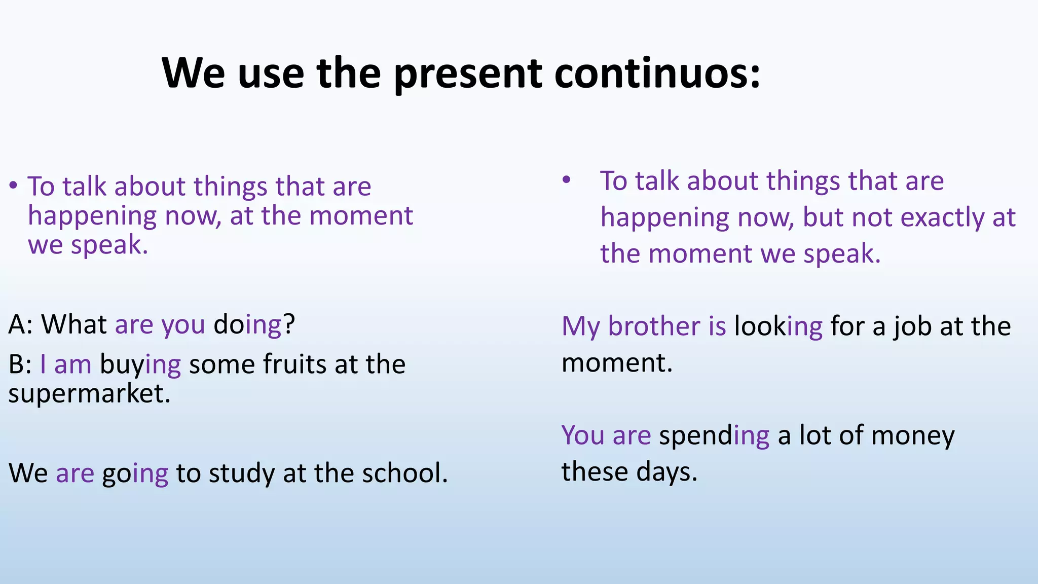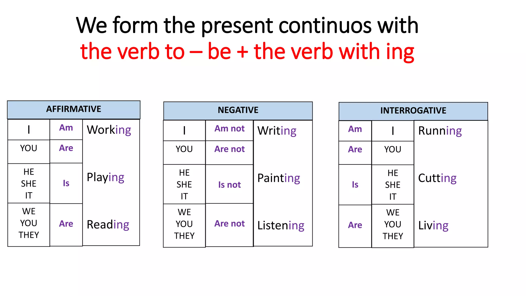 This document provides information about forming the present continuous tense in English. It discusses how to form the affirmative, negative, and interrogative forms using the verb "to be" plus the verb with "-ing." Examples are given for each person (I, you, he, she, it, we, they). Spelling rules are also outlined, such as adding "-ing" to most verbs, deleting the "-e" for verbs ending in a consonant plus "e," changing "-ie" to "-ying" for verbs ending in "-ie," and doubling the final consonant for verbs ending in a vowel-consonant. Exceptions to the spelling rules are also noted.