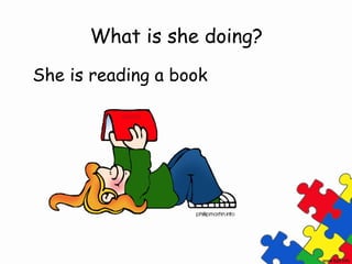 The document discusses the present continuous tense, including its four main uses: 1) actions happening now, 2) temporary actions, 3) ongoing changes, and 4) future arrangements with a time reference. It also covers the formation of the present continuous, noting that it takes the verb "be" plus the present participle "-ing" form of the main verb. Finally, it provides some spelling rules for forming verbs in the "-ing" form.