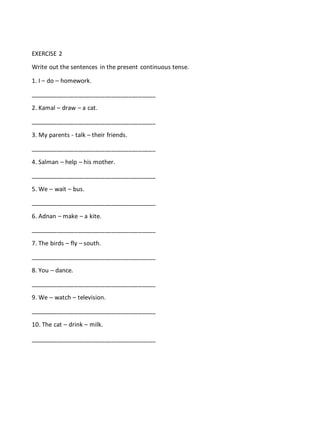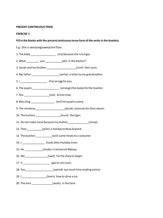The document contains two exercises for practicing the present continuous tense in English. The first exercise provides sentences with blanks to be filled in with the present continuous form of verbs in brackets. The second exercise gives sentences to be rewritten in the present continuous tense. The exercises focus on using verbs like "cry", "do", "visit", "write", "fry", and "work" in the present continuous construction to describe actions that are happening now or ongoing.