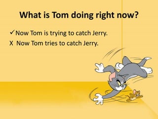 This document provides an overview of the present continuous tense in English. It explains that the present continuous is used to talk about actions that are happening at or around the time of speaking. It gives examples of forming sentences in the present continuous with the verbs "be" plus the verb ending in "-ing". It also provides an exercise to convert sentences into questions by using question words like "is", "are", etc.