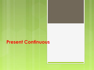 The document provides instruction on using the present continuous tense in English. It discusses how to form the present continuous by using the subject + to be + verb + ing. It provides examples of affirmative, negative, and interrogative sentences. It also discusses using the present continuous to describe actions happening now or regularly happening these days. The document then provides exercises for students to practice forming and using the present continuous tense through questions, pictures, and a game.
