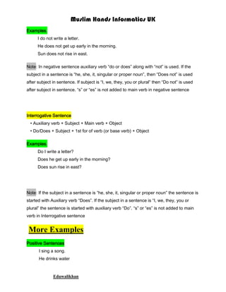 This document provides examples and rules for using the present indefinite tense in English. The present indefinite tense is used to express habitual or daily actions in the present time. It explains that the first form or base form of the verb is used in positive sentences. Auxiliary verbs like "do" or "does" are used in negative and interrogative sentences, along with the base verb form without adding "s" or "es". Several examples are given for positive, negative and interrogative sentences to illustrate the rules for using the present indefinite tense.