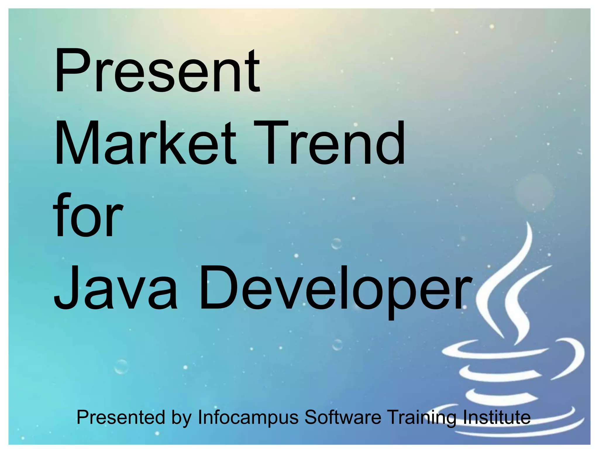 The document discusses the current market trends for Java developers and provides an overview of the Java programming language. It notes that Java is an object-oriented language that supports cross-platform development and has easy to use APIs. It also discusses the career opportunities for Java developers such as software developer, EJB programmer, and web programmer. Java developers can earn salaries ranging from Rs. 2-12 lakh annually depending on their experience and certifications. The document promotes Java training courses from Infocampus Software Training Institute.