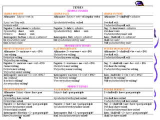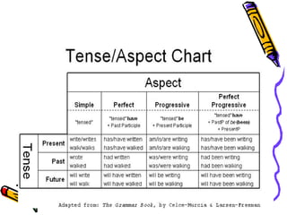 This document discusses verb tenses in English including past, present, and future tenses. It covers the three main tenses - present, past, and future - as well as four aspects - simple, continuous, perfect, and perfect continuous. For each tense, it provides examples, explanations of usage, and indicators to identify each tense. It discusses the simple present, present perfect, present progressive, past, past perfect, past progressive, future, future perfect, and future progressive tenses.