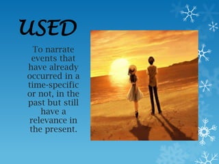 The document describes the uses of the present perfect tense in English. It is used to narrate events that occurred in the past but are still relevant to the present. It is formed using has/have plus the past participle of the verb. The present perfect can be used to describe experiences, changes over time, accomplishments, uncompleted actions being expected, and multiple actions occurring at different times in the past.