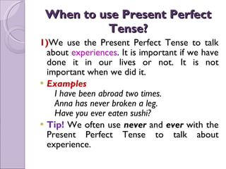 1. The present perfect tense is used to talk about experiences that have occurred at unspecified times in the past. It is used to discuss actions that began in the past and continue in the present, or that have results in the present.