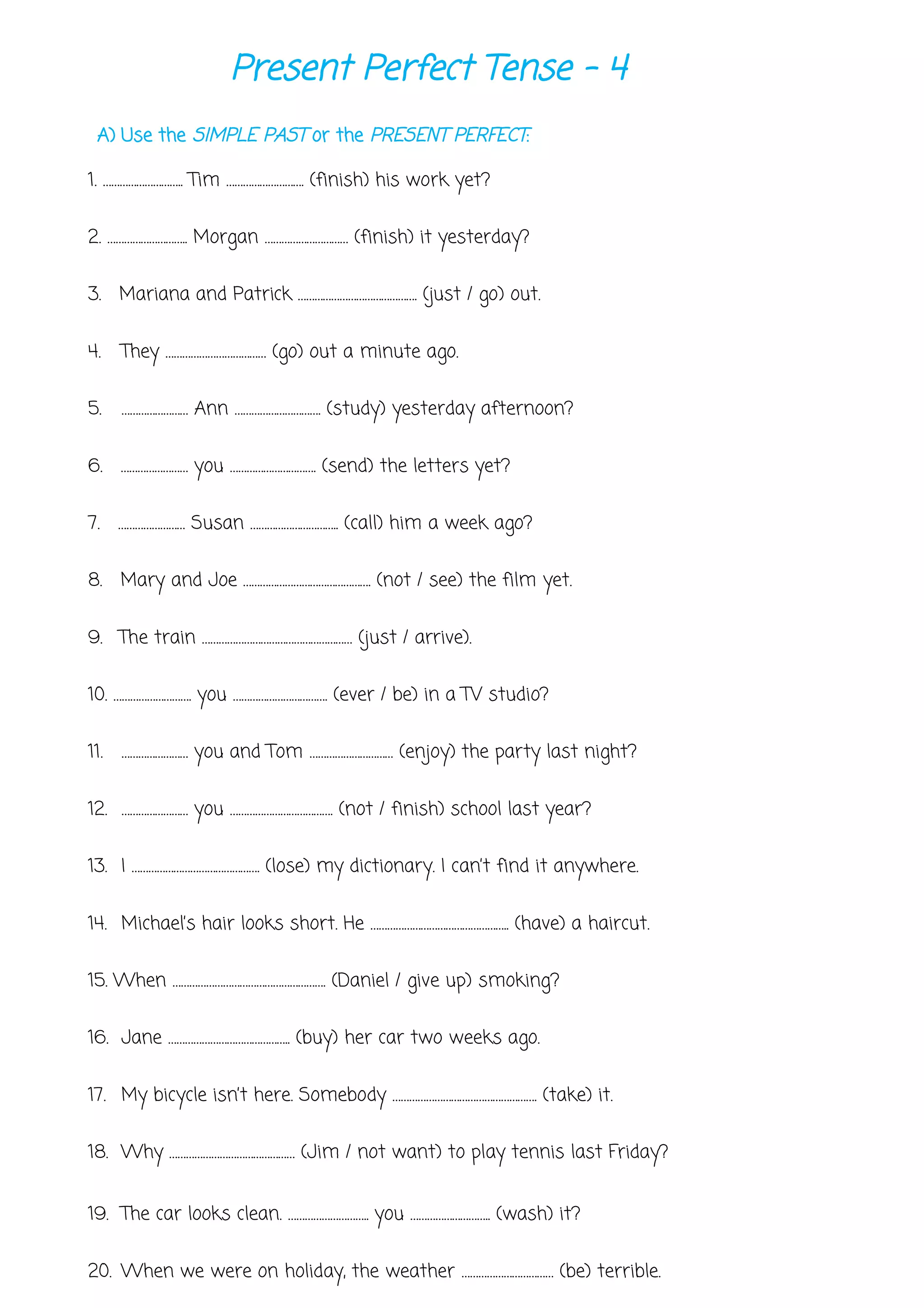 Tim has not yet finished his work. Morgan finished her work yesterday. Mariana and Patrick have just gone out. You have not sent the letters yet. The train has just arrived. Michael has had a haircut. Jane bought her car two weeks ago.