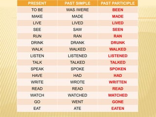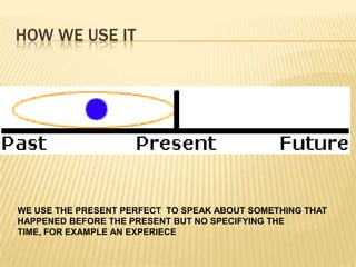 The document discusses the use of the present perfect tense in English. It is used to describe events that began in the past and continue in the present or events that happened at an unspecified time before now. Examples are provided to illustrate how the present perfect is used to talk about experiences, changes over time, accomplishments, uncompleted actions, and actions that occurred multiple times. Time expressions that can be used with the present perfect are also discussed.