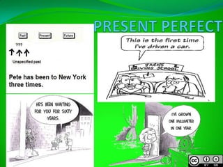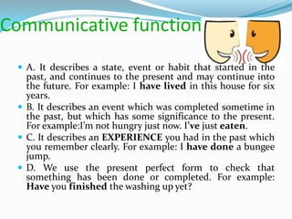 The document describes the communicative functions and grammar structure of the present perfect tense. It explains that the present perfect tense is used to describe an event that began in the past and continues in the present or has relevance in the present. It provides examples of the present perfect tense structure using auxiliary verbs like "have" and past participles. It also discusses time expressions that can be used with the present perfect tense to specify duration or limit the timeframe being referred to.