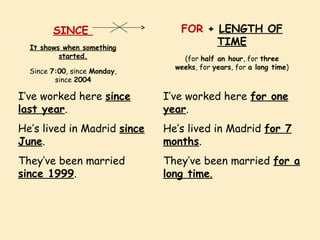 This document provides examples and explanations of how to use various perfect tenses and time expressions in English to talk about past actions and experiences. It discusses using the present perfect tense to talk about actions that began in the past and continue to the present or have present results. It also covers using "since" and "for" to indicate when something started, and the expressions "ever", "already", "just", "yet", and asking "how long" to provide additional context about the timing or duration of events.