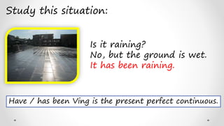 The present perfect continuous tense is used to describe an activity that began in the past and has continued up until now or recently stopped. It is formed using have/has been + verb+ing. Some key uses include describing activities that have been ongoing for a specific period of time (e.g. "I have been working for 2 hours"), activities that have been happening repeatedly over a period (e.g. "they have been going there for years"), and activities that were interrupted recently (e.g. "where have you been?"). It is not normally used with stative verbs or words like "ever" and "never".