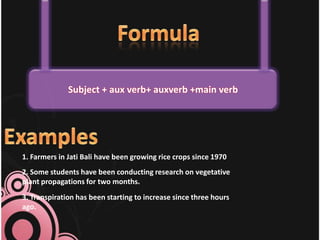 The document discusses the present perfect continuous tense and how it is used to talk about the duration of events that started in the past and have continued up until the present. It provides examples of how to form the present perfect continuous tense using auxiliary verbs like "have" and "been" as well as examples of common uses like describing past experiences, changes over time, accomplishments, unfulfilled expectations, and activities with durations involving words like "for" and "since". It also discusses the placement of time adverbs and the uses of "already" and "yet" with the present perfect continuous tense.