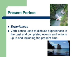 This document provides an overview of the present perfect tense in English, including its three main uses: 1) something that started in the past and is still ongoing now, 2) indefinite past actions where the time is unspecified, and 3) repeated past actions. It discusses the form of the present perfect (subject + have/has + past participle), examples of irregular past participles, key time words used with the present perfect like "already" and "never", and the placement of adverbs. It also covers using "since" to indicate a specific point in the past and "for" to indicate a duration of time. Finally, it provides links to additional online practice with the present perfect tense.
