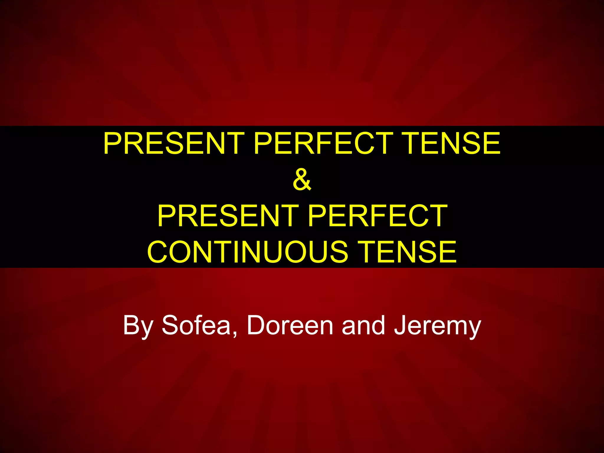 This document provides an overview of the present perfect tense and present perfect continuous tense in English grammar. It explains that the present perfect tense is used to describe an action that began in the past and either continues in the present or is completed. The present perfect continuous tense describes an action that began in the past and is ongoing. It provides examples and explanations of how to form sentences in these tenses, including conjugating verbs according to pronoun cases. Exercises are included for the reader to practice changing verbs to these tenses.