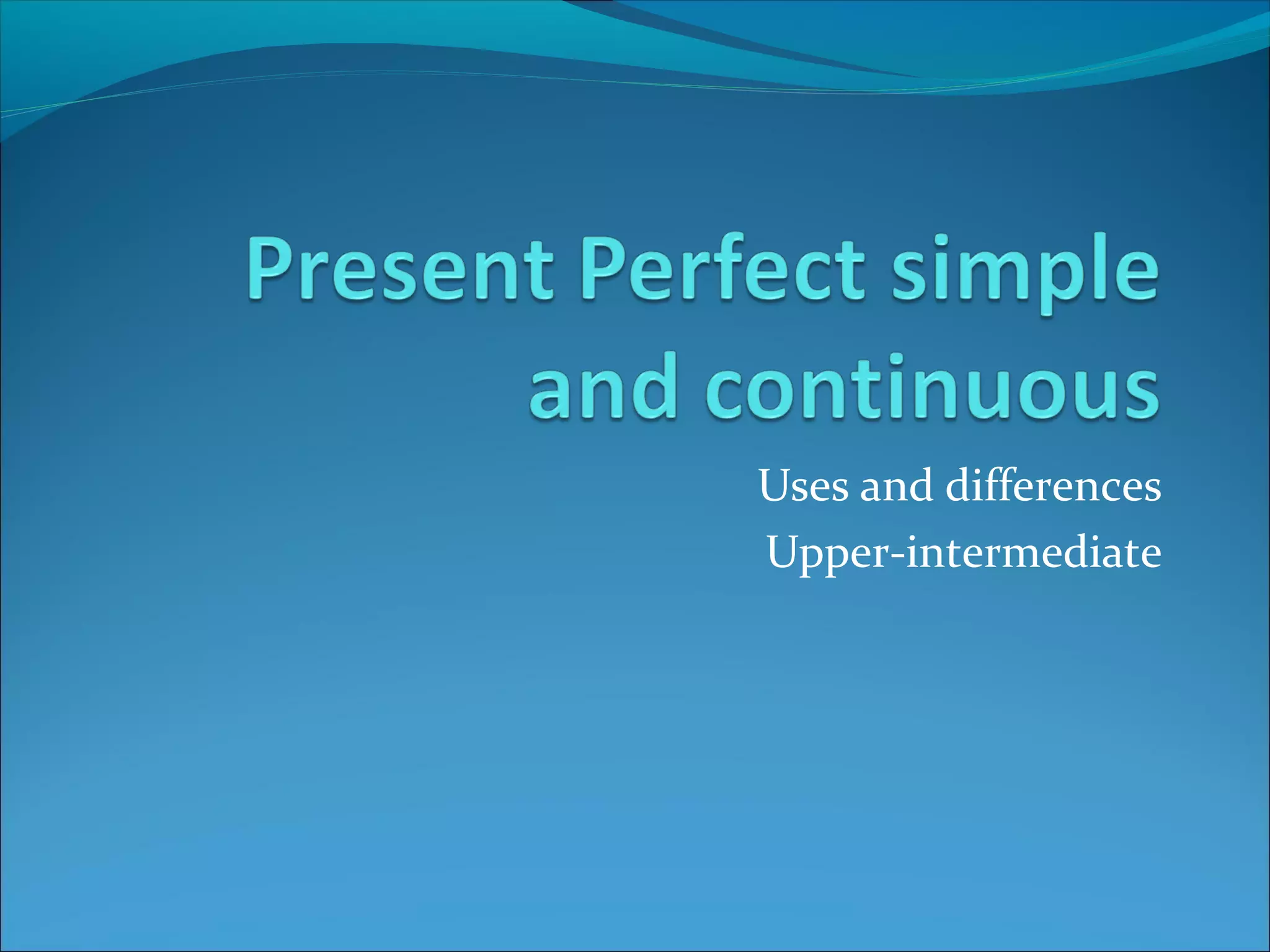 The document discusses the uses and differences between the present perfect simple and present perfect continuous tenses. The present perfect simple is used to talk about ongoing situations that began in the past and continue to the present, as well as completed recent actions. The present perfect continuous emphasizes the duration of an ongoing action. It is used for repeated or continuous actions that may or may not be finished. Some examples are provided to illustrate the differences between the tenses.