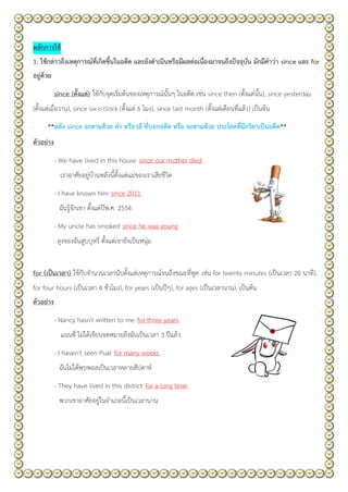 1. ใช้กล่าวถึงเหตุการณ์ที่เกิดขึ้นในอดีต และยังดาเนินหรือมีผลต่อเนื่องมาจนถึงปัจจุบันมักมีคาว่า since และ for