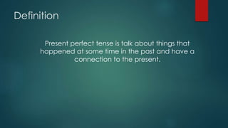 The document defines and provides examples of the present perfect tense. The present perfect tense is used to talk about actions that began in the past and have relevance to the present. It discusses the forms of the present perfect tense for both verbal and nominal clauses. Examples are given for positive, negative, and question forms. Common words used with the present perfect tense are defined, including "since," "already," "ever," "for," "just," and "yet."