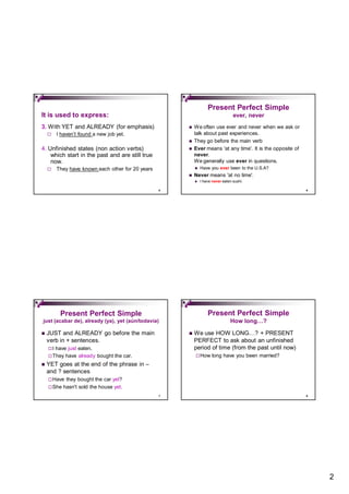 The document discusses the present perfect simple tense in English. It provides examples of its use to express past experiences, recent past actions, unfinished states, and actions that began in the past and continue in the present. Key points include using the present perfect with words like "yet", "already", and "for" and "since" to indicate a period of time. The difference between using the past simple and present perfect is explained, with the past simple used for finished actions and the present perfect connecting the past to the present. Practice questions are provided to illustrate using each tense appropriately.