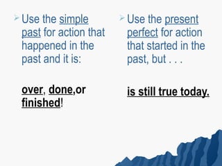 The document summarizes the difference between the simple past and present perfect tenses in English. It explains that the simple past is used for actions completed in the past, while the present perfect is used for actions that began in the past but continue in the present or may happen again. It provides examples comparing sentences using each tense and discusses time words commonly used with each.