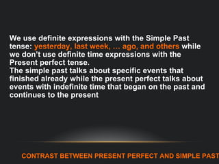The present perfect tense is used to describe actions that began in the past and continue in the present or have relevance in the present, without specifying a definite time period. In contrast, the simple past tense describes actions that were completed entirely in the past. Some key differences are that the present perfect can be used with expressions like "ever" and "never" while the simple past requires specific time references like "yesterday" or "last year." Examples are provided to illustrate using each tense to talk about completed past actions versus ongoing/relevant present actions.