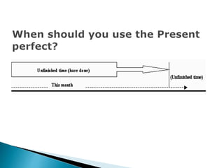 This document discusses the use of present perfect tense in English. It is used to emphasize the result of a past action without specifying time, describe an action that began in the past and continues in the present, or refer to life experiences at some point in the past. Examples are provided for each use, including emphasizing a past result, describing an ongoing action, talking about life experiences, and forming questions and negative statements with "ever" and "never".