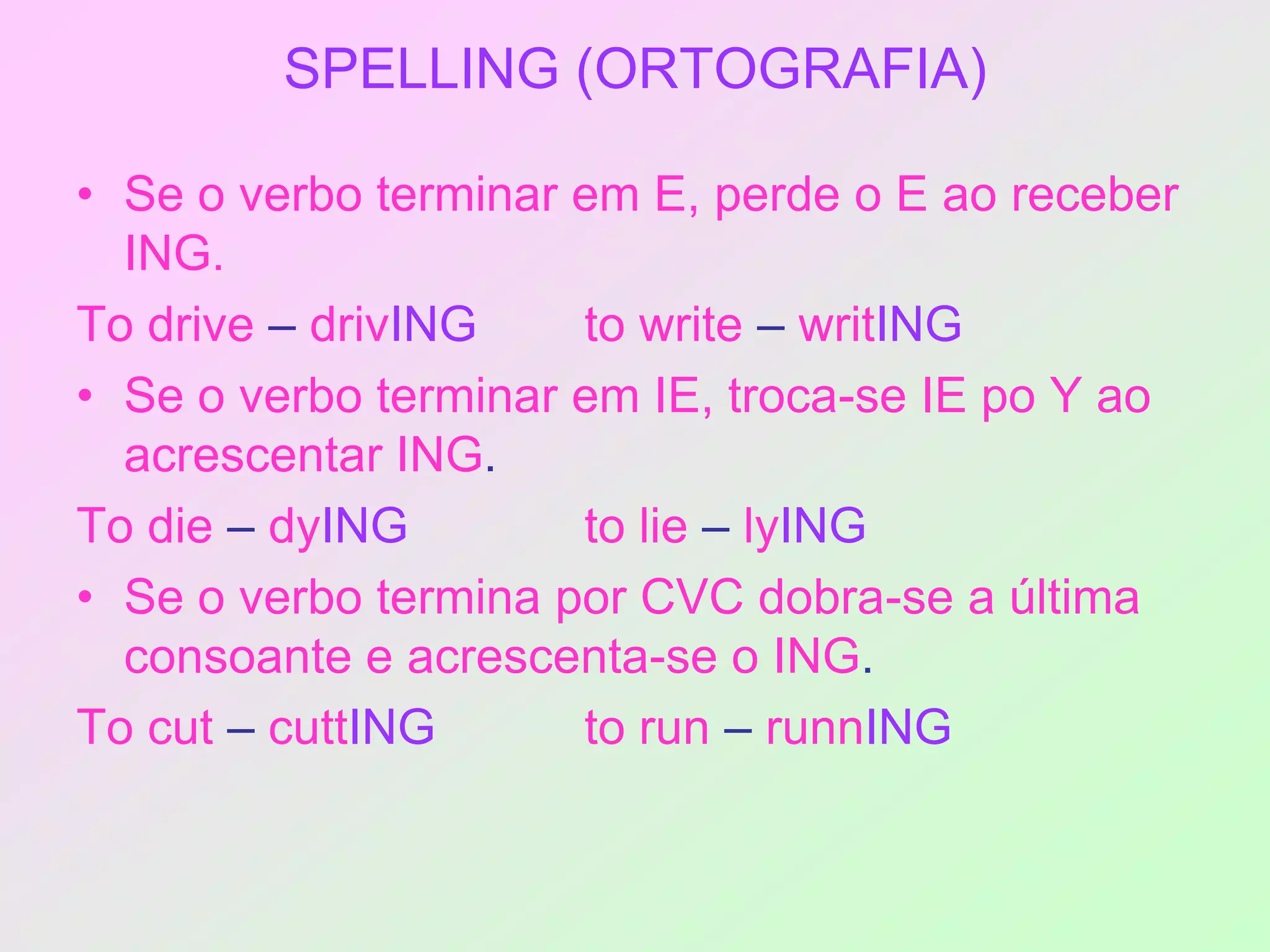 The document provides information about spelling rules when adding "-ing" to verbs in English and describes the present progressive tense. It explains that the present progressive expresses actions that are occurring at the moment of speaking or currently. The structure is given as subject + am/is/are + verbING + complement. Examples are given of affirmative, negative, and interrogative sentences in the present progressive tense.