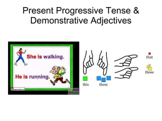 The document discusses the present progressive tense in Spanish and demonstrative adjectives. It explains that the present progressive tense uses estar plus a verb ending in -ando or -iendo to describe an ongoing action, such as "I am eating" or "He is singing." It then defines the demonstrative adjectives este/a/os/as for objects that are close, ese/a/os/as for objects that are farther away, and aquel/a/os/as for objects that are very far away.