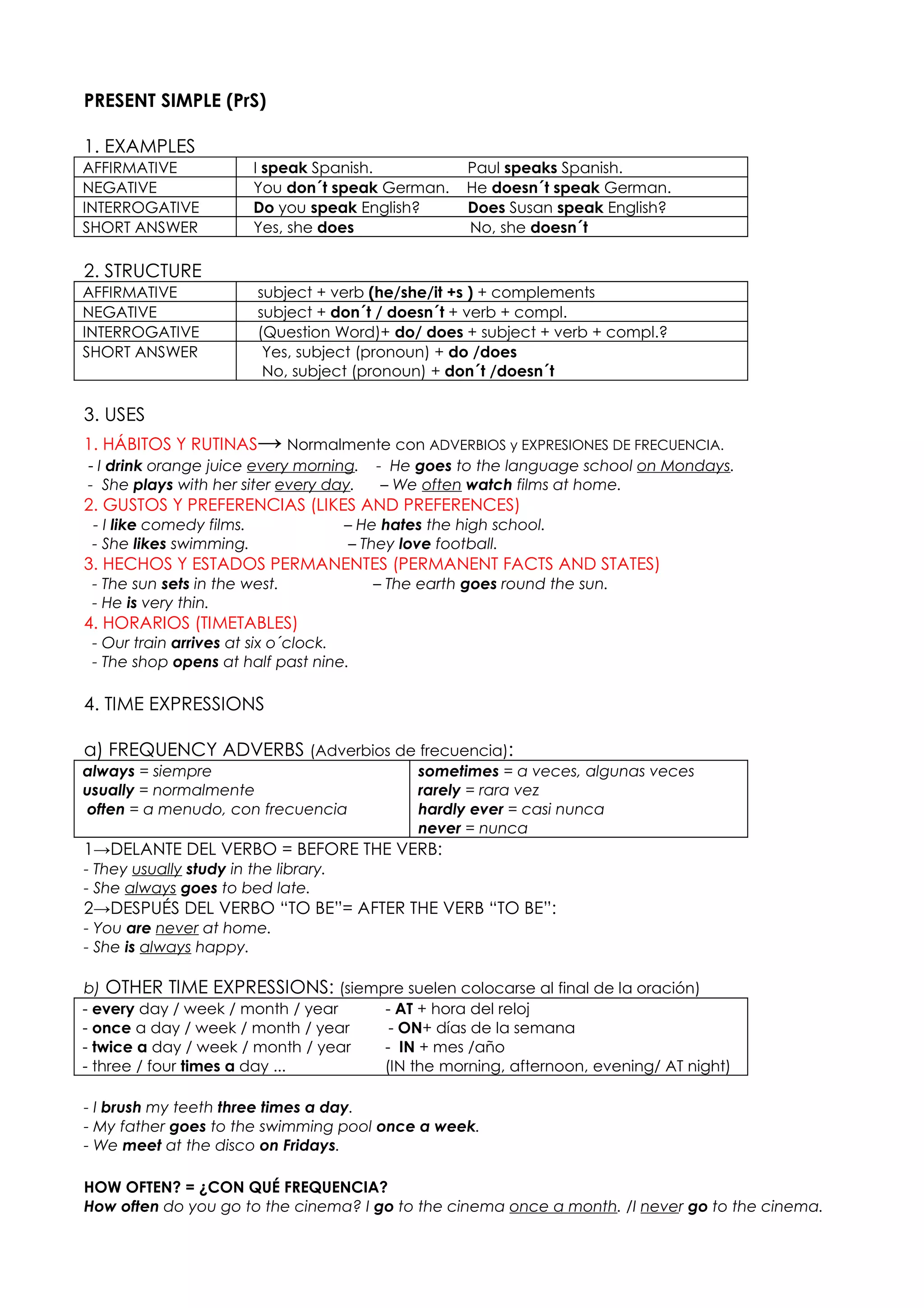The present simple is used to describe habitual or routine actions, permanent states, likes/dislikes, and timetables. It follows a consistent subject+verb structure. The present continuous is used for actions happening now and includes expressions like "now" or "at the moment". It follows the structure of subject+be+verb+ing. The document provides examples of how to distinguish between using the present simple versus present continuous depending on whether an action is habitual or occurring presently.