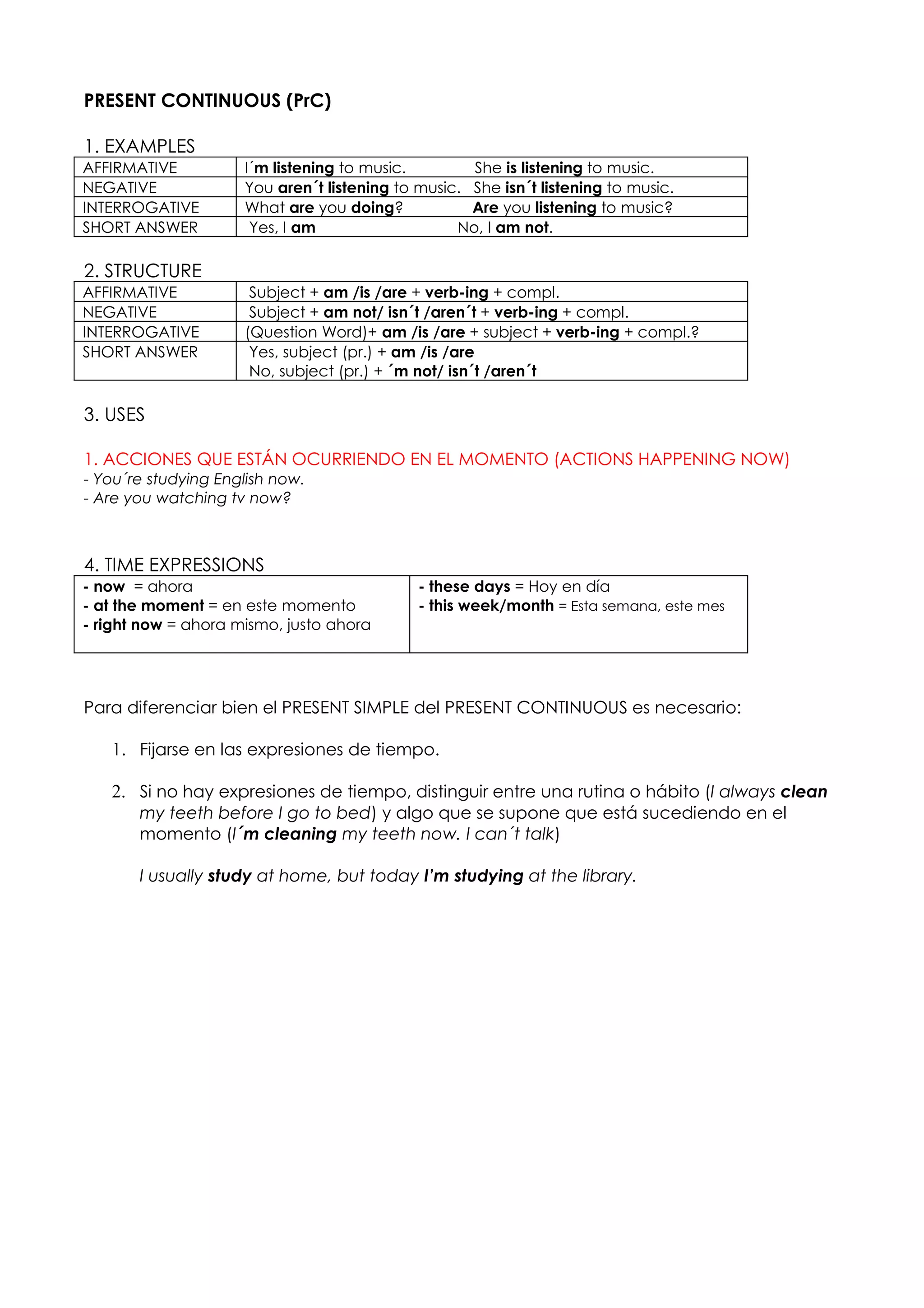 This document provides examples and explanations of the present simple and present continuous tenses in English.