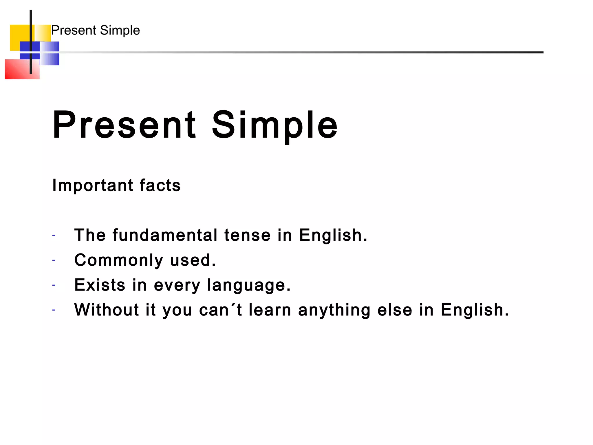 This document provides information about the present simple tense in English. It discusses that the present simple is the fundamental tense, is commonly used, and exists in every language. It then explains how to form positive and negative sentences and ask questions in the present simple. It gives examples of its usage for repeated actions, general truths, permanent actions, and timetables/schedules. Finally, it lists common adverbs used with the present simple and question words.