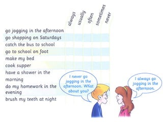 The document provides information about present simple tense usage. It is used for repeated actions or daily routines, permanent states, and general truths or laws of nature. Examples are given such as "She usually plays tennis at the weekend" and "The sun sets in the west." Positive and negative forms are demonstrated along with questions. Additional examples describe what various people do on different days of the week.