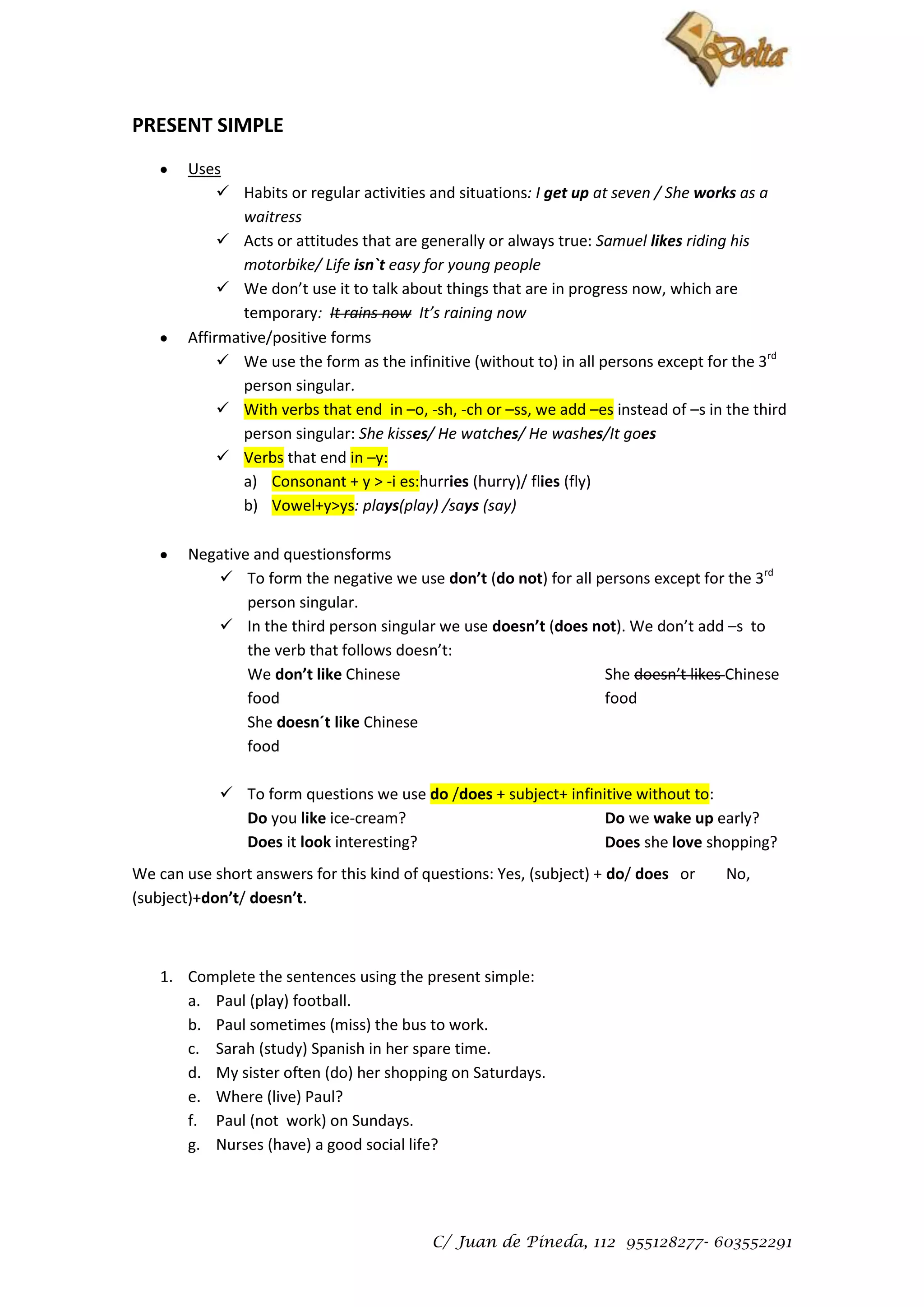The document discusses the present simple tense in English. It outlines its uses for habits, regular activities, and generally true statements. It provides examples of affirmative and negative forms, including how the verb changes in the third person singular. Questions are formed using do/does plus the subject and infinitive verb. Examples are given of completing sentences and questions in the present simple. [/SUMMARY]