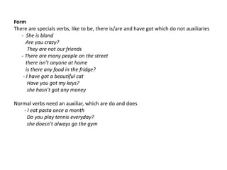 The document explains the use of the present simple tense, highlighting special verbs like 'to be,' 'there is/are,' and 'have got' that do not require auxiliaries. It describes its application for routines, truths, and the use of frequency adverbs, while also noting that certain verbs, referred to as non-action verbs, are not used in the present continuous form. Additionally, it covers the placement of question words in relation to auxiliaries in questions.