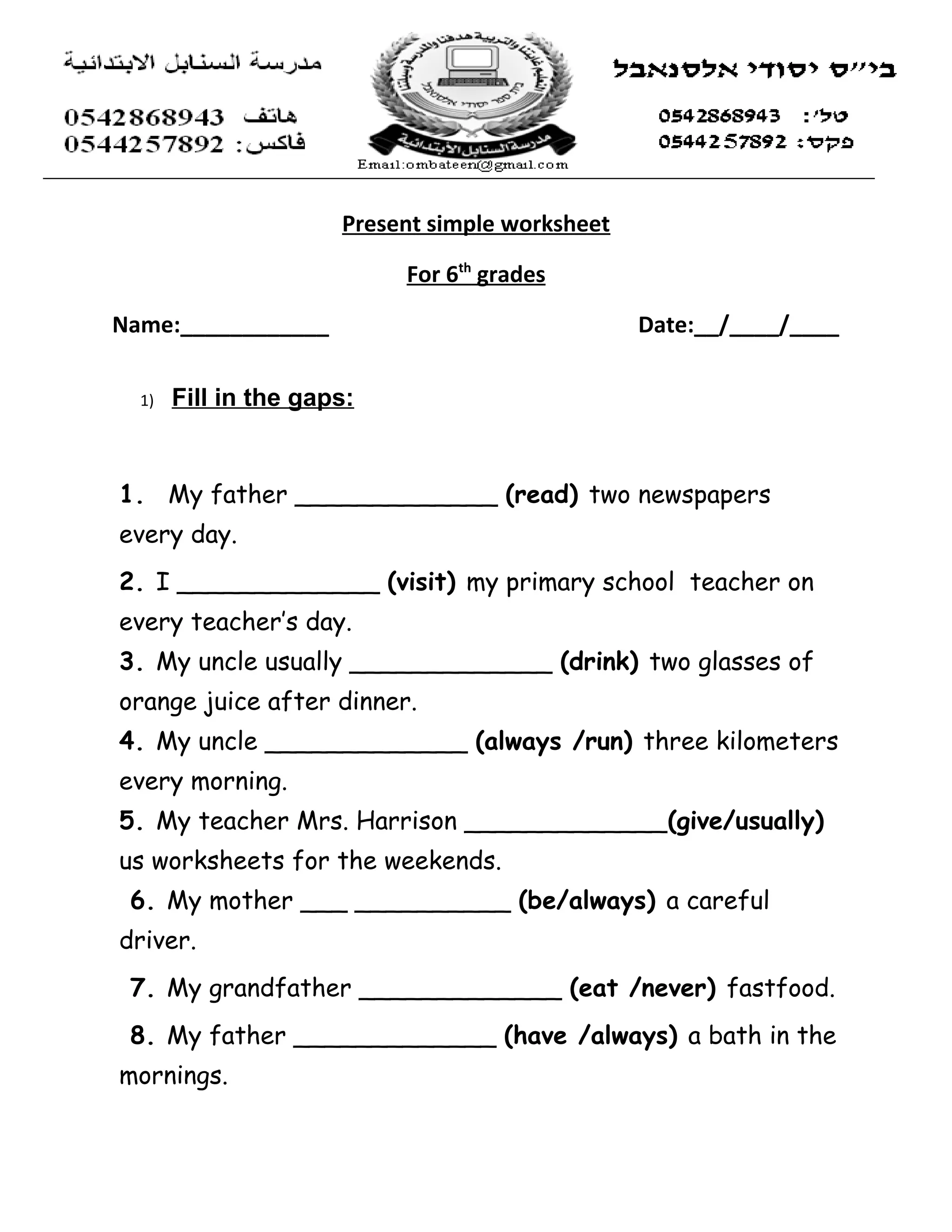 This document contains a simple present tense worksheet for 6th grade students. It includes exercises for students to fill in blanks with simple present verbs, form sentences using prompts, and answer questions in complete statements. The worksheet focuses on common simple present tense patterns like daily routines, repeated actions, and general truths. It aims to help 6th graders practice and reinforce their understanding of simple present tense grammar.