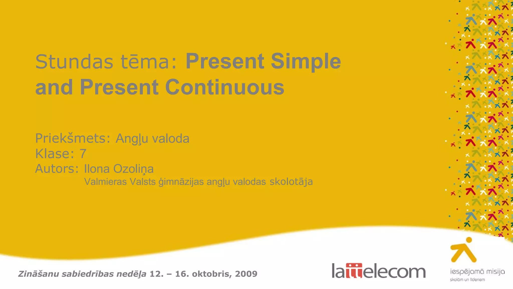 Prezentācija paredzēta 7.klasei, lai apgūtu vienkāršo un ilgstošo tagadni angļu valodā, izmantojot James Wolf dzīves piemērus. Stundas laikā tiek atsvaidzinātas zināšanas par abiem laikiem un sniegti praktiski piemēri katram no tiem. Prezentācija var tikt izmantota gan stundas sākumā, gan beigās kā refleksīvs materiāls.