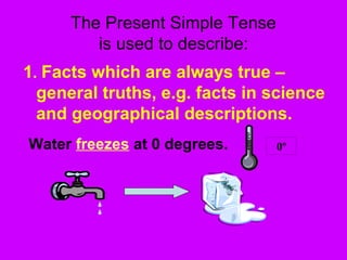 The document discusses the present simple tense in English. It is used to describe facts that are always true, habitual actions that occur regularly expressed with frequency adverbs, and opinions or feelings. Examples are provided of affirmative, negative, and interrogative sentences in the present simple tense, including how the third person singular is formed. Common time expressions like frequency adverbs and references to days or times are also presented.