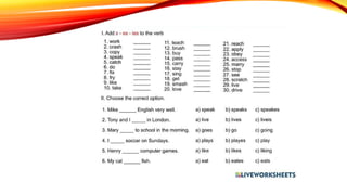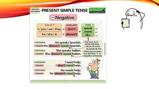 The document discusses the present simple tense, focusing on adverbs of frequency and their usage. It includes aspects such as structure, spelling rules, information questions, and auxiliary verbs like 'do/does.' Additionally, it highlights the negative form and encourages practice on these topics.