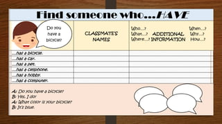 This document provides examples of using the present simple verb "have" to ask and answer questions about what items or possessions someone has. It shows affirmative and negative statements using "have" such as "I have a new car" and "You don't have a new car". It also gives examples of yes/no questions using "do/does" like "Do you have a new car?" and answers like "Yes, I do" or "No, I don't". The purpose is to demonstrate how to form questions and statements in the present simple tense using the verb "have".