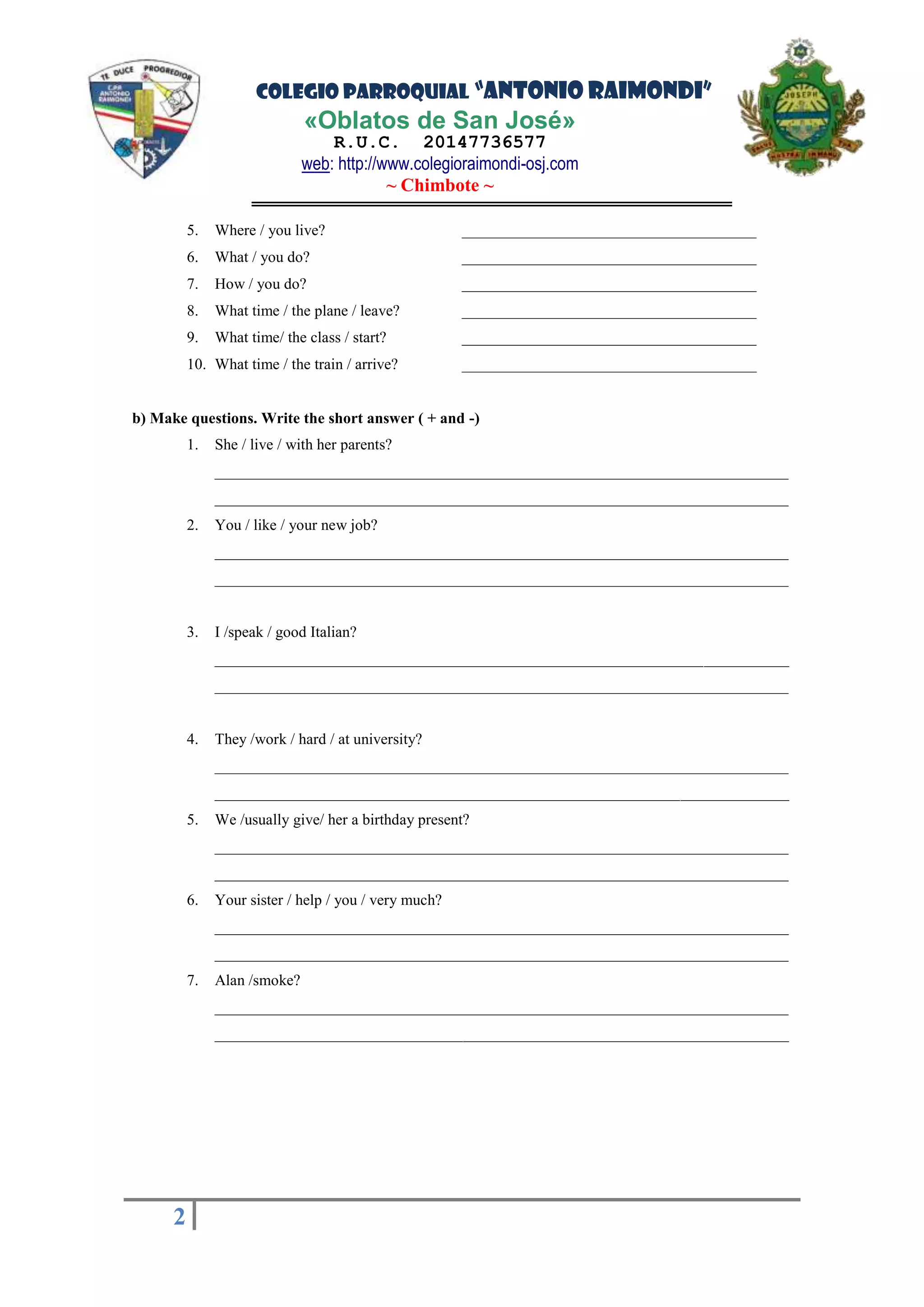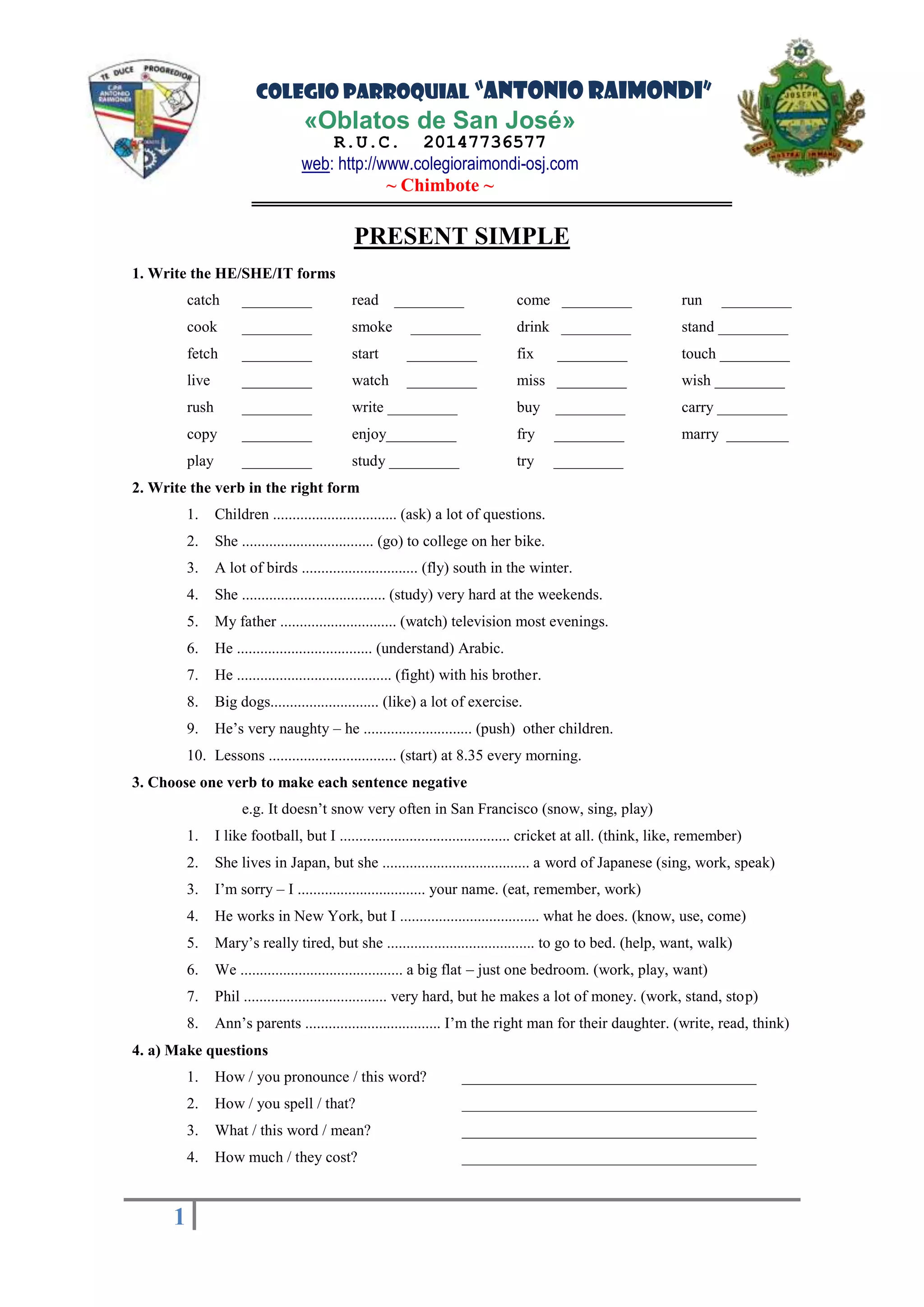 This document contains an exercise in Spanish about verb tenses, including the present simple and present continuous. It provides examples of sentences using verbs in these tenses and asks students to complete sentences by conjugating verbs correctly or choosing the appropriate tense. The document is from a Peruvian parochial school and provides practice with verb forms for students learning Spanish.