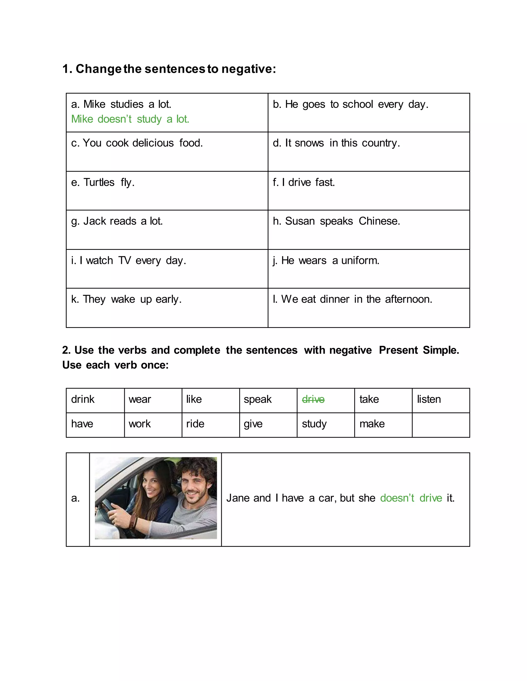 The document contains exercises to practice changing sentences to their positive and negative forms in the present simple tense. It includes changing individual sentences, completing sentences with the correct verb form, and writing sentences about oneself using given verbs. The exercises focus on transforming sentences by changing the verbs to their opposite polarity and filling in the missing verbs or verb phrases.