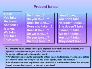 The document discusses present tense verb conjugations in English. It provides the base form of verbs for each subject pronoun in simple present tense positive statements. It also covers adding "s" to verbs for he/she/it subjects. The document then discusses how to form questions using "Do" or "Does" plus the base verb form, and how to form negative statements using auxiliary verbs like "Do" or "Does" plus "not".