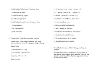 The document discusses the different tenses in Indonesian, including present tense, past tense, and future tense. It provides the formulas and examples of sentences for several tenses: