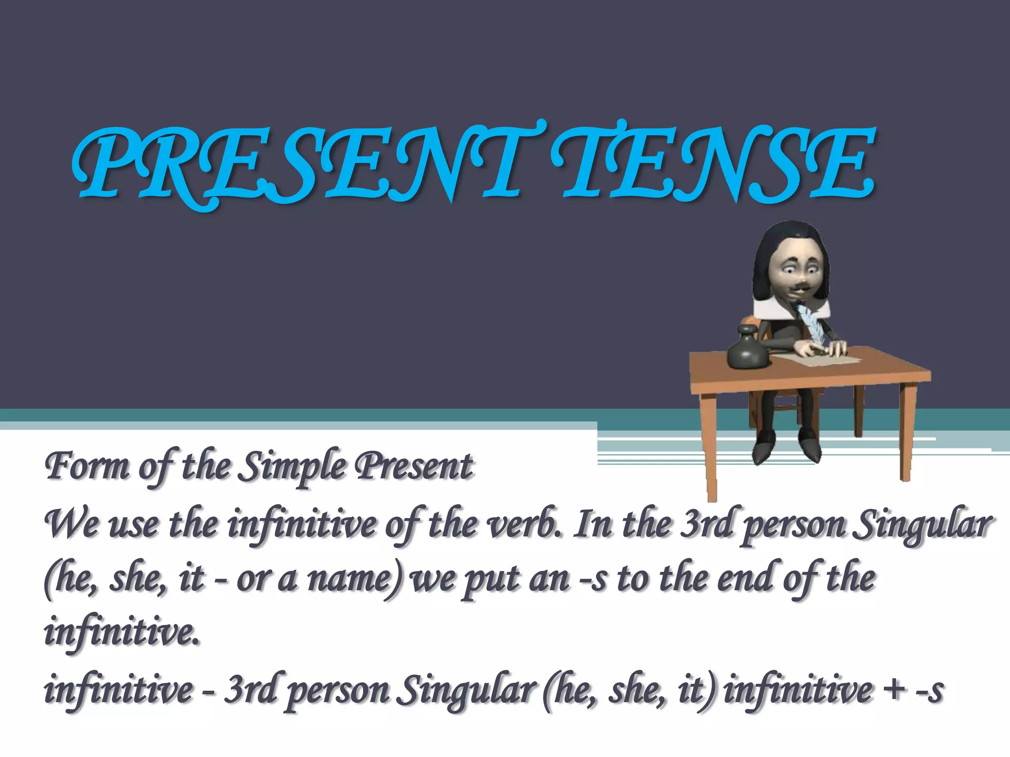 The document discusses the simple present tense in English. It explains that for the third person singular (he, she, it), the infinitive form of the verb takes an -s ending. It provides examples of affirmative, negative, and interrogative sentences in the simple present tense, noting the use of auxiliary verbs and contractions. It also lists some common verbs that are used in the simple present tense.