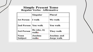 The document discusses tenses in English and provides details about the four forms of present tense: